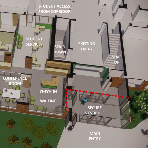 The new front entrance will use a 3-step entry system designed to safely welcome visitors. A guest’s first stop will be in the Secure Vestibule. Next, a guest will be granted access to the Entry and Waiting Area, where they will be greeted and checked-in by staff. After a guest has received a Visitor ID Badge, they may proceed to staff offices within the Welcome Center or be granted access to the student area of the school (e.g. gym, performing arts center, commons).