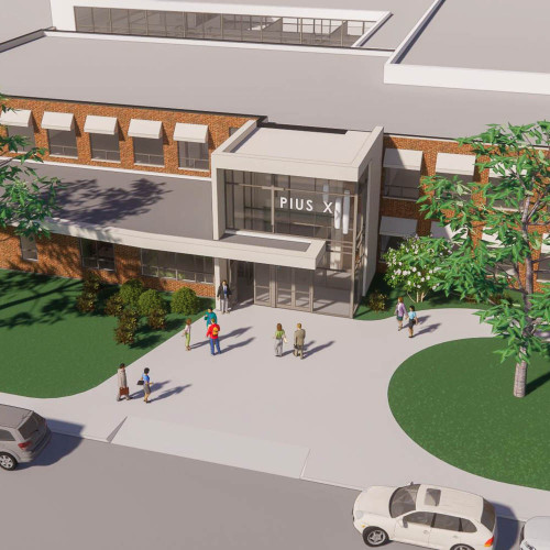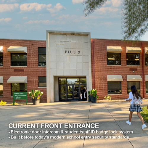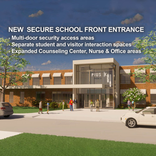 Pius X High School serves approximately 1,100 students annually, and welcomes thousands of visitors from Lincoln and beyond for a wide range of events every year. The Pius X Foundation is seeking support to build a new school front entrance that will enhance safety and security, while creating a central “welcome center” for students’ families and visiting community members. There is an urgent need to move forward on more than a decade of planning for an expanded school entrance that will incorporate 21st century safety and security standards. The project will also expand the front entrance area and repurpose existing space to better enable essential school staff to work with students’ families and visitors. Extending the front entrance to Pius X High School will provide a much-needed improvement to enhance both security and functionality.