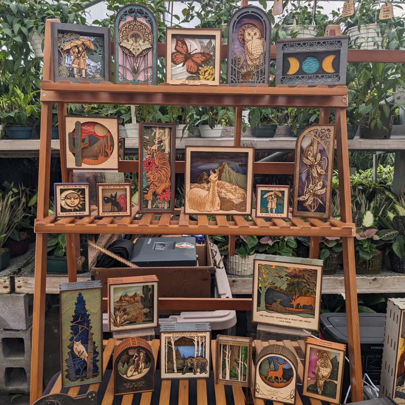 Ann and Shane Walsh, co-owners of Studio Trouvaille, combine craft and art to create one-of-a-kind shadowboxes and other decor items. Drawing inspiration from folks they meet and speak with at vendor shows, as well as from nature and abstraction, the Walshes’ creations are meant to stand out. They were guests in our pop-up shop in early 2024, and you can learn more about them on Facebook, Instagram, or their website.