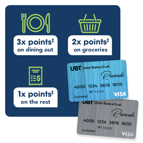 When you use your UBT credit card for lunch at your favorite restaurant or to fuel up for your next road trip, you’re earning points for every dollar you spend. You can redeem your reward points for: